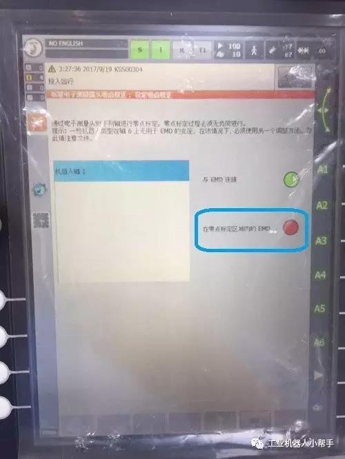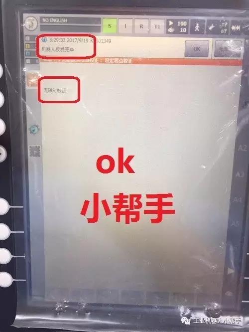 step 1:T1模式,無(wú)選擇程序,程序啟動(dòng)鍵正常,機(jī)器人各軸到達(dá)零點(diǎn)附近位置;